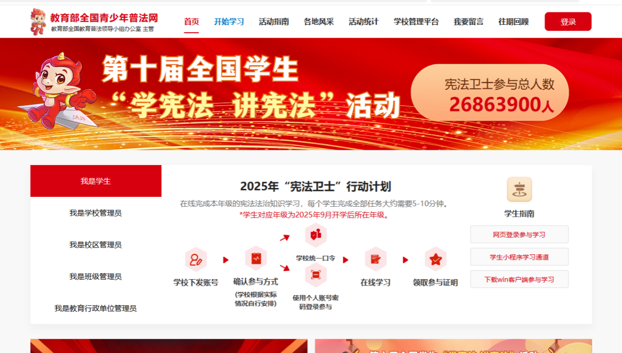 自治区教育厅将定期对各高校开展“宪法卫士”2025年行动计划在线学习、练习与综合评价的学生参与率进行通报,请各学院高度重视,积极广泛动员学生参与。学校将不定时通过后台检查完成情况,及时反馈,确保学生参与率达到100%。