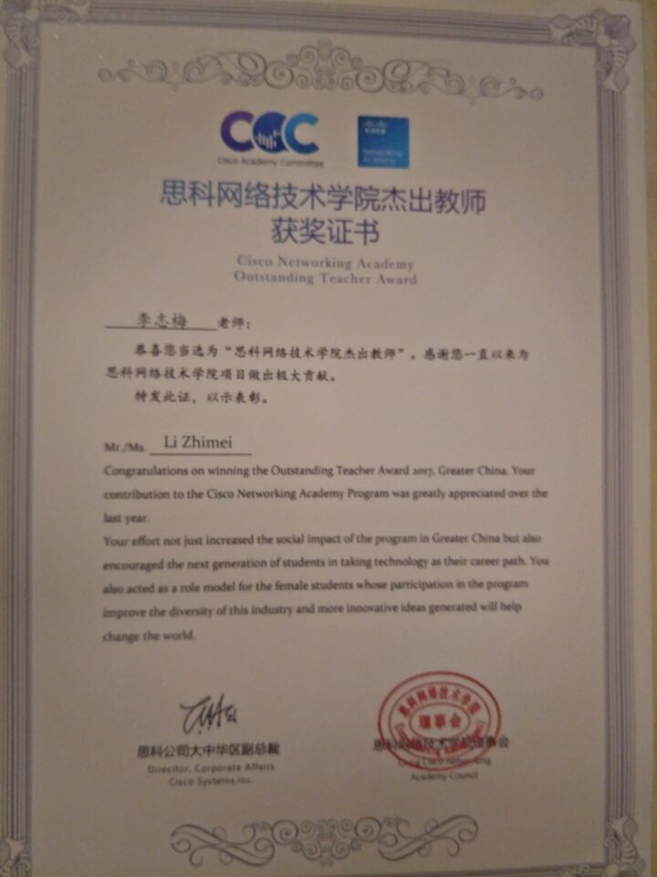 实践教学部李志梅被评为思科网络技术学院杰出教师