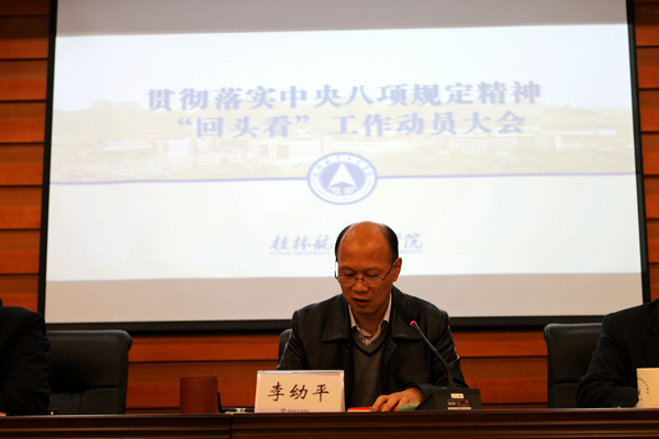 会上,党委书记李幼平就贯彻落实中央八项规定精神“回头看”工作做了动员和部署。李幼平强调,一是要深刻认识自治区党委开展贯彻落实中央八项规定精神“回头看”工作的重要性,增强思想自觉和行动自觉;二是要有问题导向,通过自查自纠、监督检查,全面梳理贯彻落实中央八项规定精神的情况,通过多措并举、综合施策,确保中央八项规定精神在学校落地生根。三是要以贯彻落实中央八项规定精神“回头看”工作为契机,抓好作风建设,营造好敢于担当、敢于干事的创业氛围,落实好工作目标责任制,推动学校中心工作和重点工作顺利完成。