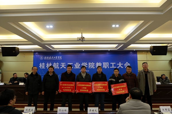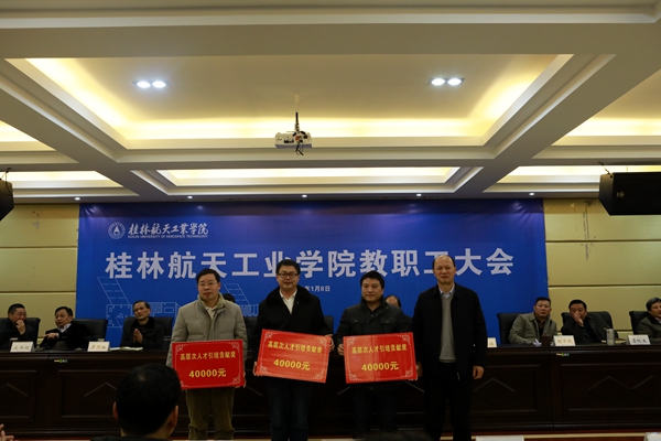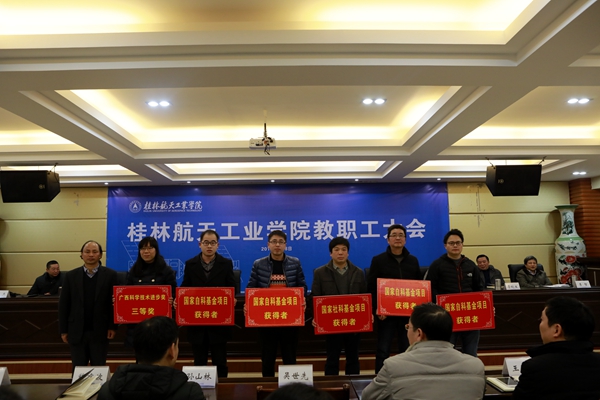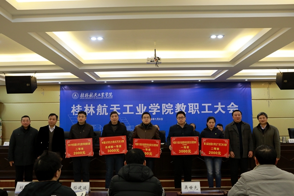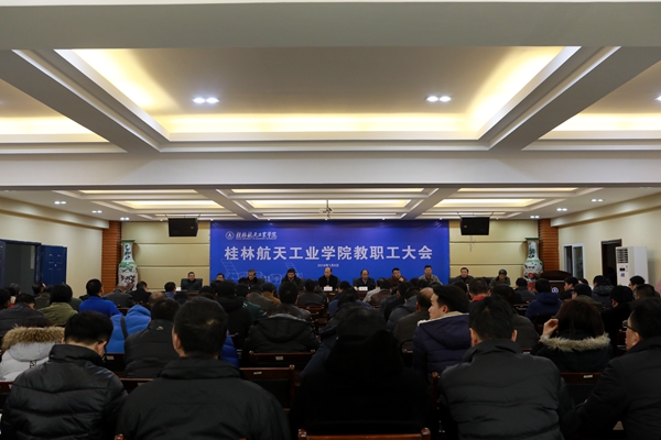 党委书记李幼平作重要讲话,他说,2017年学校在教学、科研方面取得了一系列优异的成绩,从数据分析,国家级自治区级项目的主持人基本由学校高层次人才构成,学校的发展,离不开高层次人才,离不开博士教授,学校将进一步采取措施,加大投入来推动人才队伍的建设工作;学校在2017年共建工作中,与武汉理工大学签订了对口支持与合作协议,在我校设立了武汉理工大学硕士研究生联合培养基地,并聘请我校12名教授担任该校的硕士生导师,在与桂林电子科技大学的合作上也取得重要进展。新校区的建设和资金筹措工作稳步开展,8000平米的新校区球类运动场都已投入使用,总面积达4万平米的学生公寓楼和留学生公寓楼已经开工建设;在航天特色文化建设工作中,我校将“航天精神筑魂、航天文化育人”作为学校文化建设的理念,大力开展航天文化传承创新方面的工作,密切与航天系统的联系,促进了人才培养和科研工作。