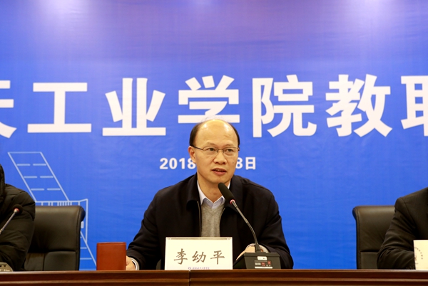 校长易忠在发言中从人才培养水平、师资建设力度、科学研究成果、社会服务能力、文化传承创新工作、省部共建工作、国际教育工作、校园建设进程、民生保障能力九个方面详细回顾了我校2017年取得的成绩。同时,易忠指出,2018年是学校深入推进“二次创业”的关键之年,是贯彻落实“十三五”规划的承上启下之年,是学校迎接本科合格评估的攻坚决战之年,学校将以合格评估为主线,以人才培养为中心,以面向航天为特色,以基础建设为保障,积极调动广大师生员工的积极性、主动性、创造性,汇聚改革发展的强大力量,推进学校各项事业新发展,并对2018年的重点工作进行了说明。