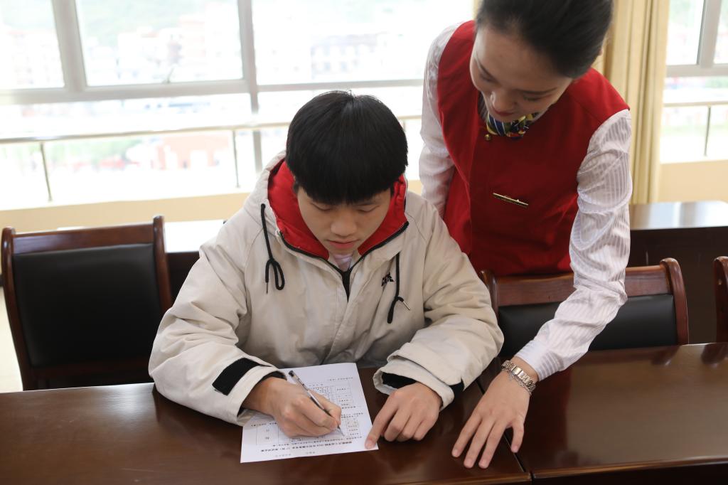 在候考室里,来自百色的考生刘天宇正在做着面试环节的最后准备。“等待面试还是有点紧张,但我也为这次考试做了充足的准备,我会带着自信去面对考官,希望能实现自己的空乘梦想。”刘天宇说。