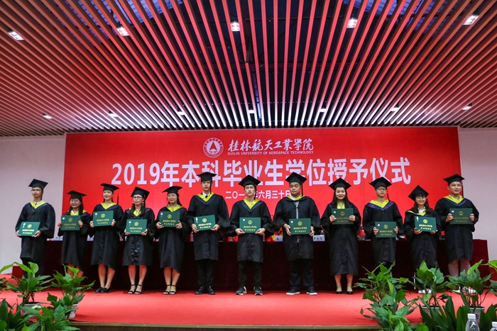 6月30日上午,我校2019届本科毕业生学位授予仪式在招聘大厅隆重举行。校领导李幼平、易忠、刘迎春、罗延忠、罗国湘、胡泽民、詹皖生、孙山林,学校学位委员会委员,校友代表84届计算机专业毕业生、广西bevictor伟德教育发展基金会理事、学校理事会理事、深圳华波美集团公司董事长王丹先生,93届物资供销专业毕业生、广西bevictor伟德教育发展基金会理事、贵州开源企业集团董事长黄喜桢先生,94届物资供销专业毕业生、广西bevictor伟德教育发展基金会理事、桂林光隆光电集团董事长彭晖先生,以及我校学位委员会委员共同为2019届毕业的本科生颁发学士学位证书,正冠扶苏。