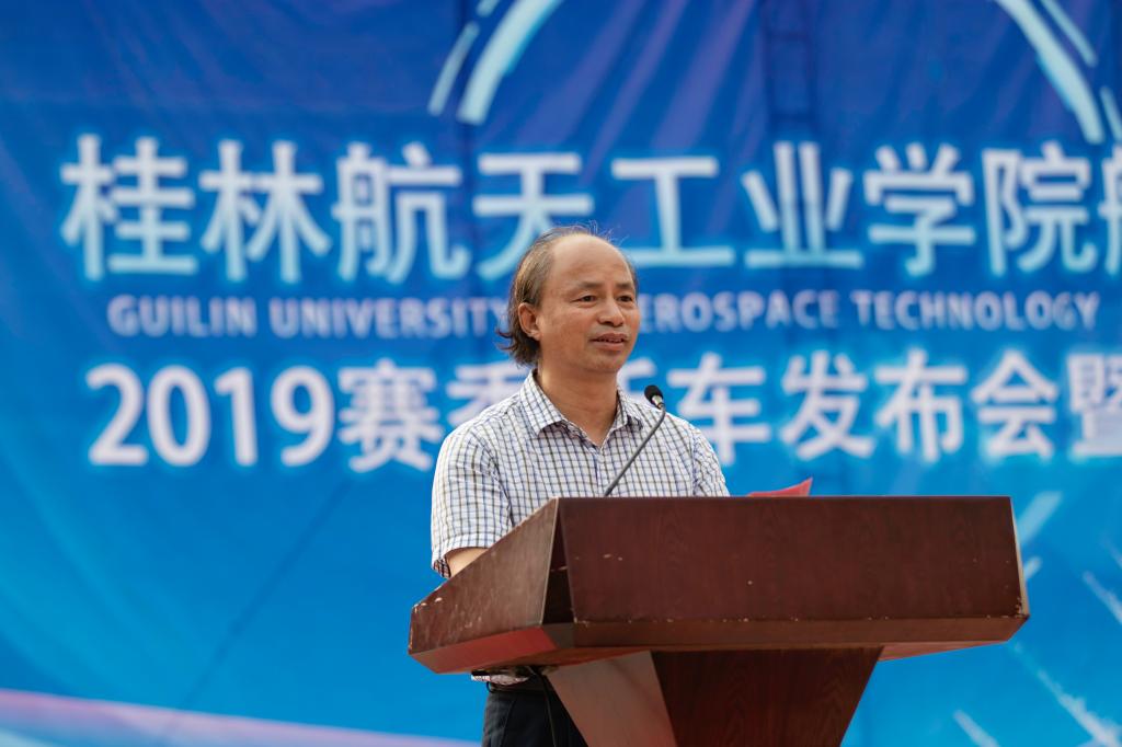 9月20日, 我校2019赛季新车发布会暨出征仪式正式举行,由在校师生自主设计、制造和调试的方程式赛车V-05号油车、航V-E03号电车崭新亮相。学校校长易忠、桂林市桂路通集团董事长程东、速才驾校总经理陈宁、学工处、校团委、教务处及各学院主要负责人出席发布会。