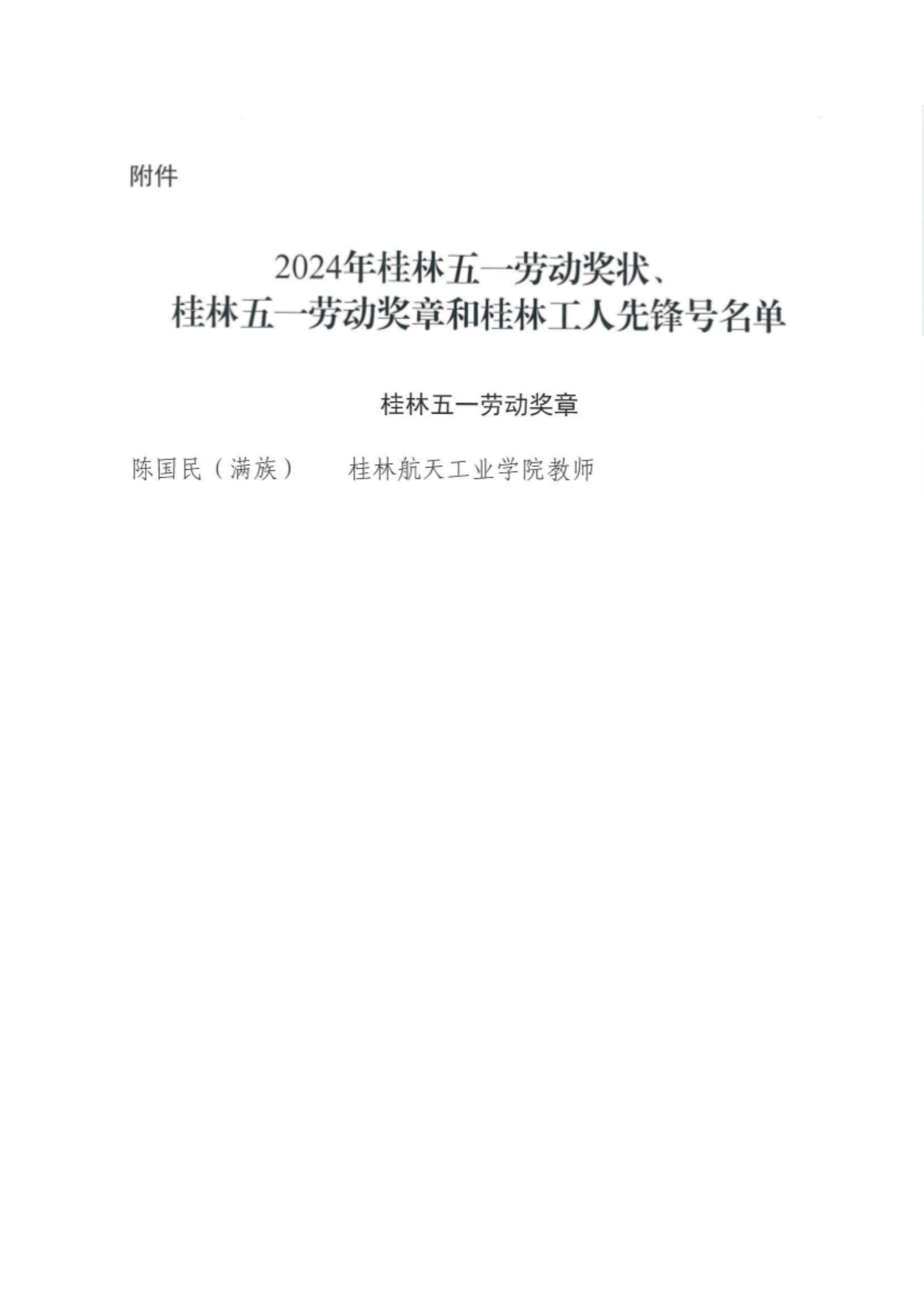 近日,桂林市总工会公布了一批2024年桂林五一劳动奖状、桂林五一劳动奖章、桂林工人先锋号名单,我校推荐的管理学院教授陈国民荣获“2024年桂林五一劳动奖章”称号。