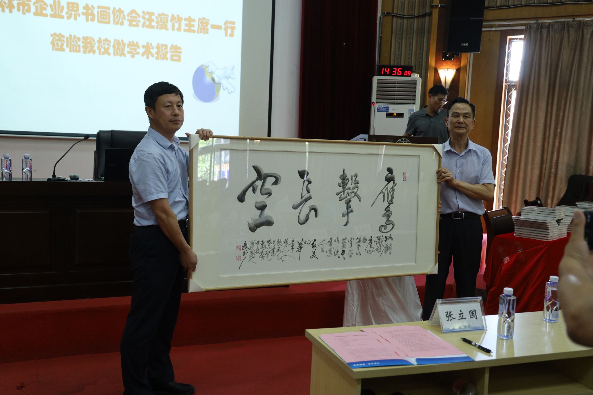 汪瘦竹首先向学校赠送了《鹰击长空》艺术书画作品,张立国致欢迎词。讲座中,汪瘦竹结合自己多年的创作经历,首先就“修德”“德在艺先”在艺术创作中的灵魂地位作了重点解析,之后就桂林山水画起源、产生及特点,元明清时代的桂林山水画进行了深入的讲解。他强调,桂林是我们共同热爱的土地,我们生活、学习在这片美丽的土地上,肩负着了解、传承和弘扬本土文化瑰宝的重任,全体师生们应该深入了解学习桂林山水画的源流,传承其深厚的历史文化和底蕴。