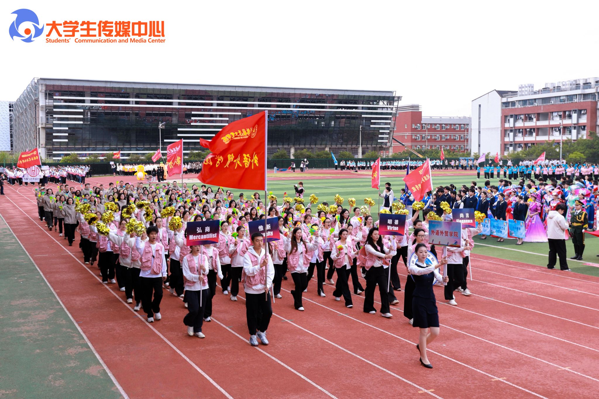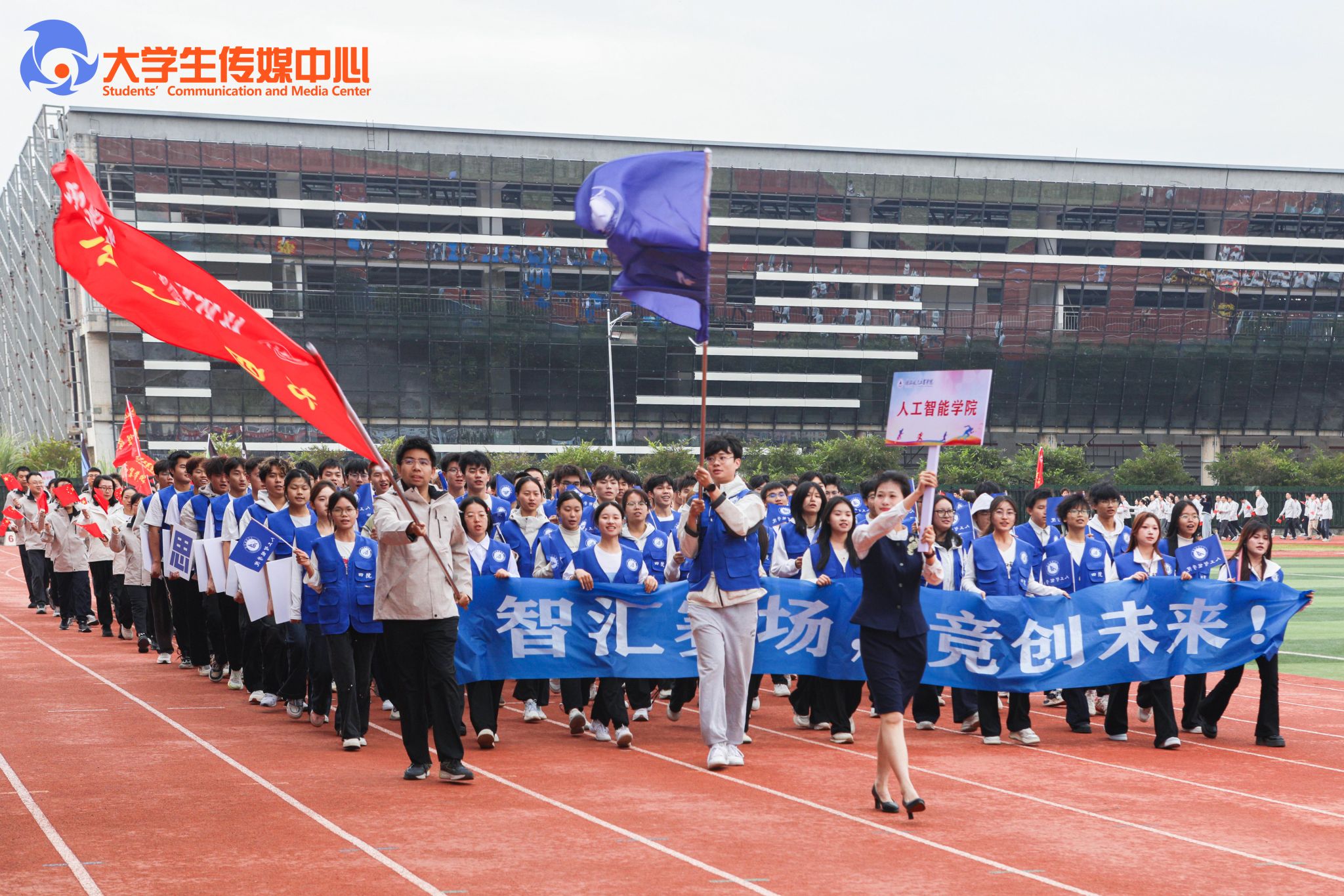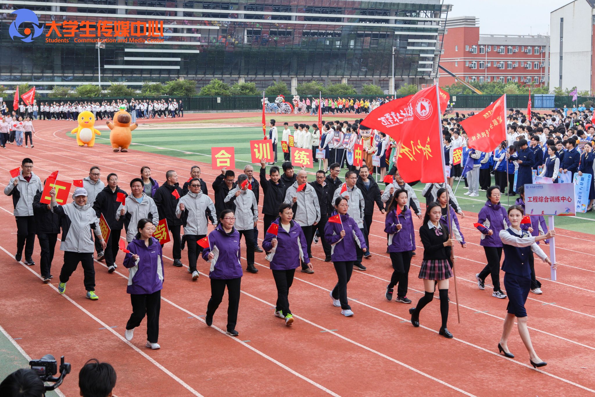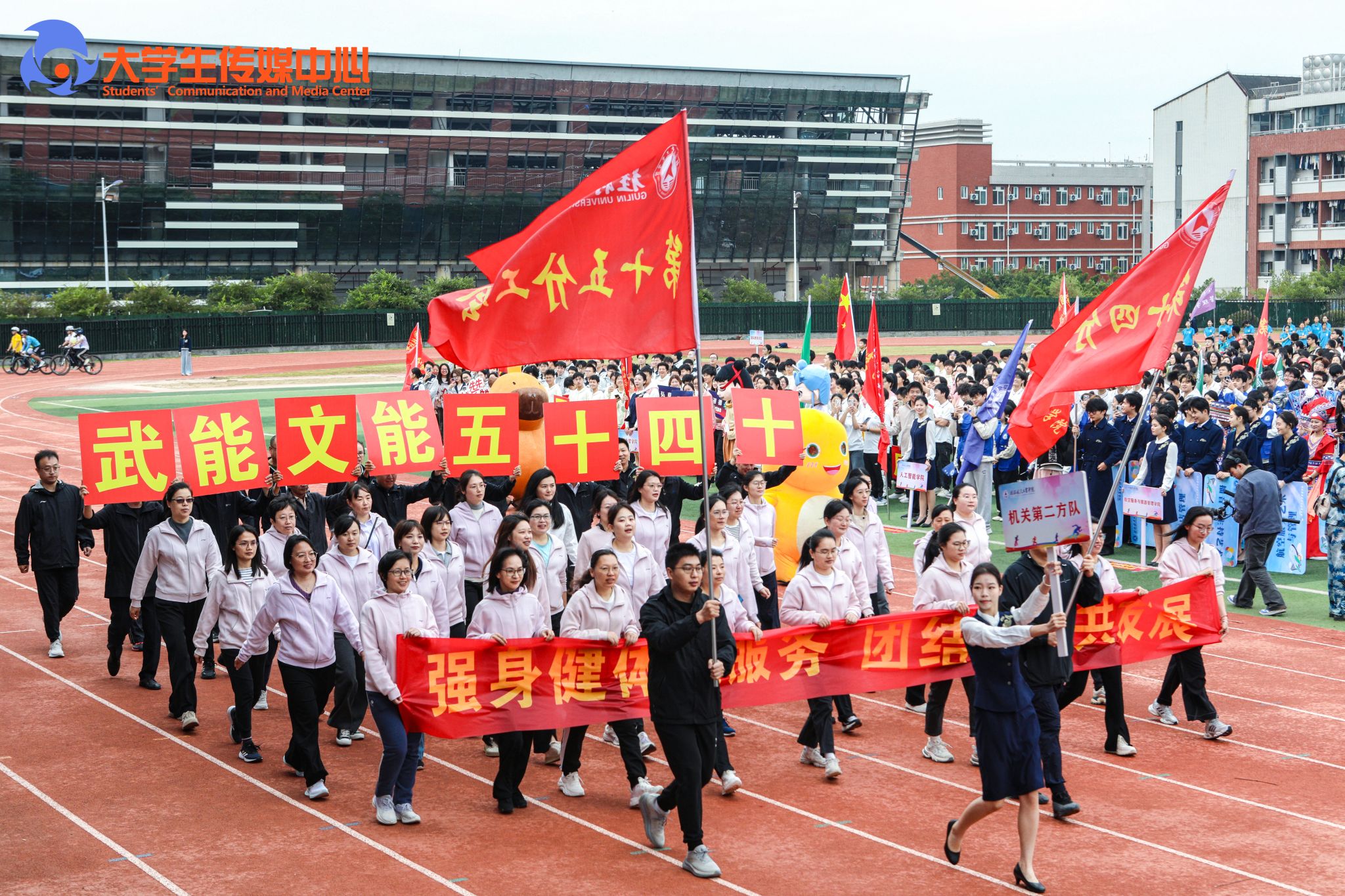 广播体操展示《律动青春》拉开了本次开幕式的序幕。国旗班方队步伐铿锵、身姿挺拔,庄严护卫五星红旗、校旗、会旗和会徽率先入场。计算机科学与工程学院与外语外贸学院组成的彩旗队,承载着科创锐气与国际视野阔步走来。随后各教学单位、机关方阵依次入场,口号嘹亮,创意纷呈、各具特色,充分展现了全校师生团结进取、奋发向上的活力与激情。