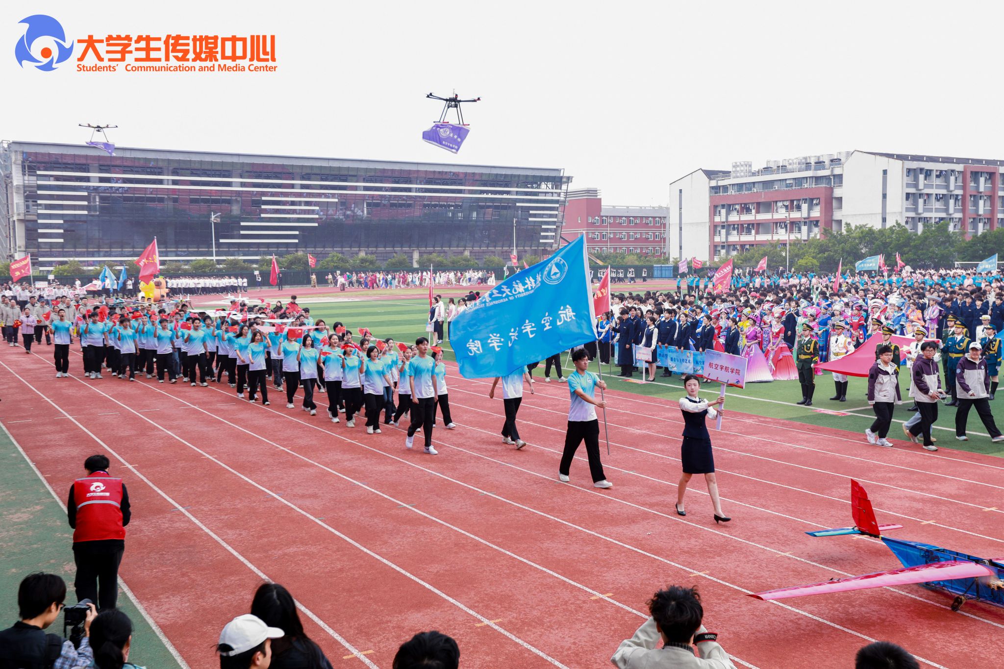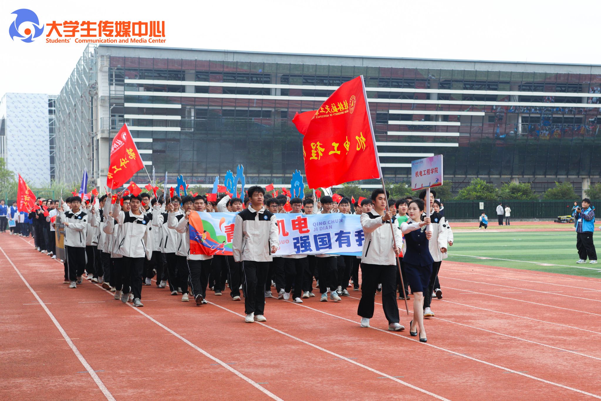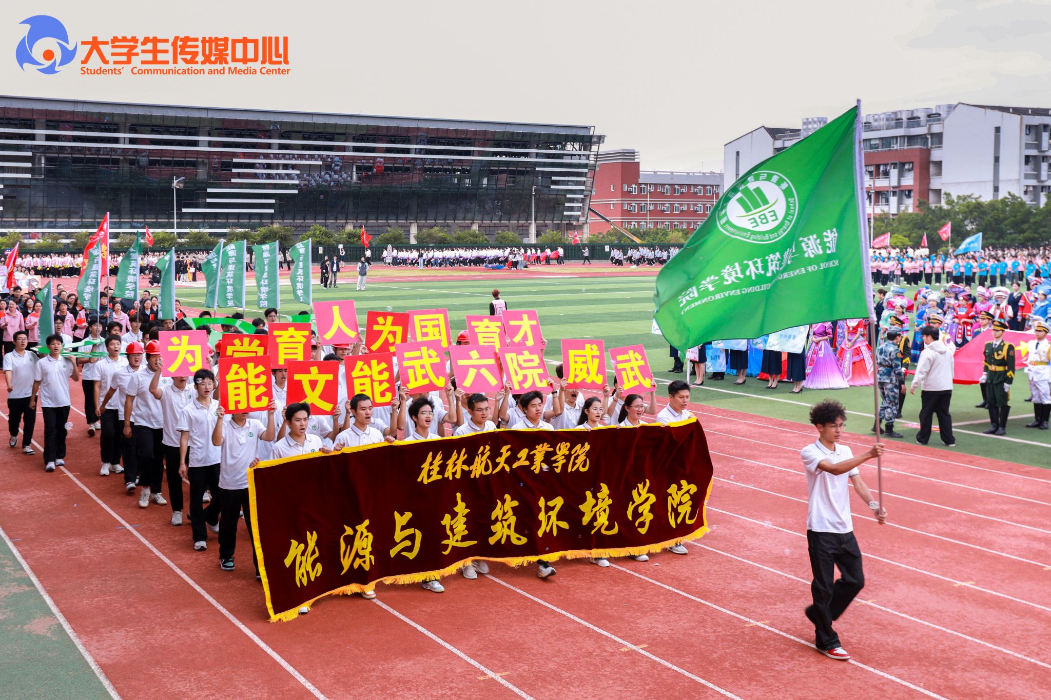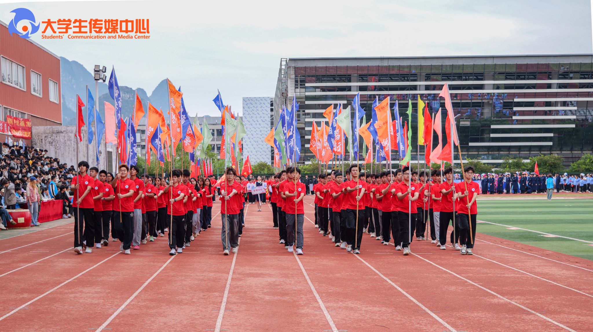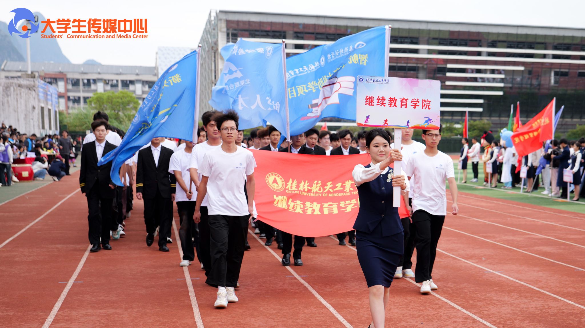 广播体操展示《律动青春》拉开了本次开幕式的序幕。国旗班方队步伐铿锵、身姿挺拔,庄严护卫五星红旗、校旗、会旗和会徽率先入场。计算机科学与工程学院与外语外贸学院组成的彩旗队,承载着科创锐气与国际视野阔步走来。随后各教学单位、机关方阵依次入场,口号嘹亮,创意纷呈、各具特色,充分展现了全校师生团结进取、奋发向上的活力与激情。